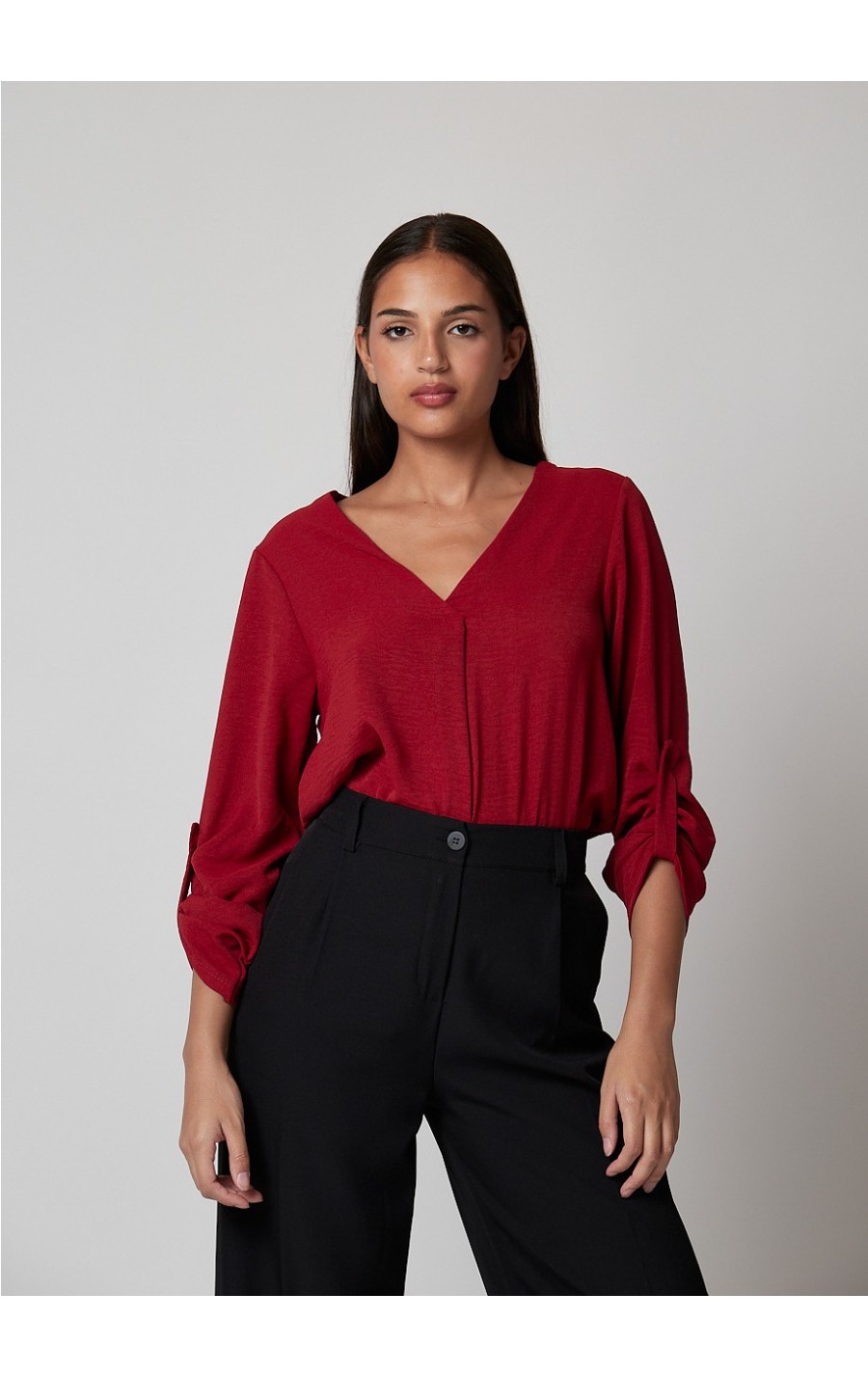 Blusa escote pico y manga con botón para fruncirla. Talla única (desde la tall S hasta la L)