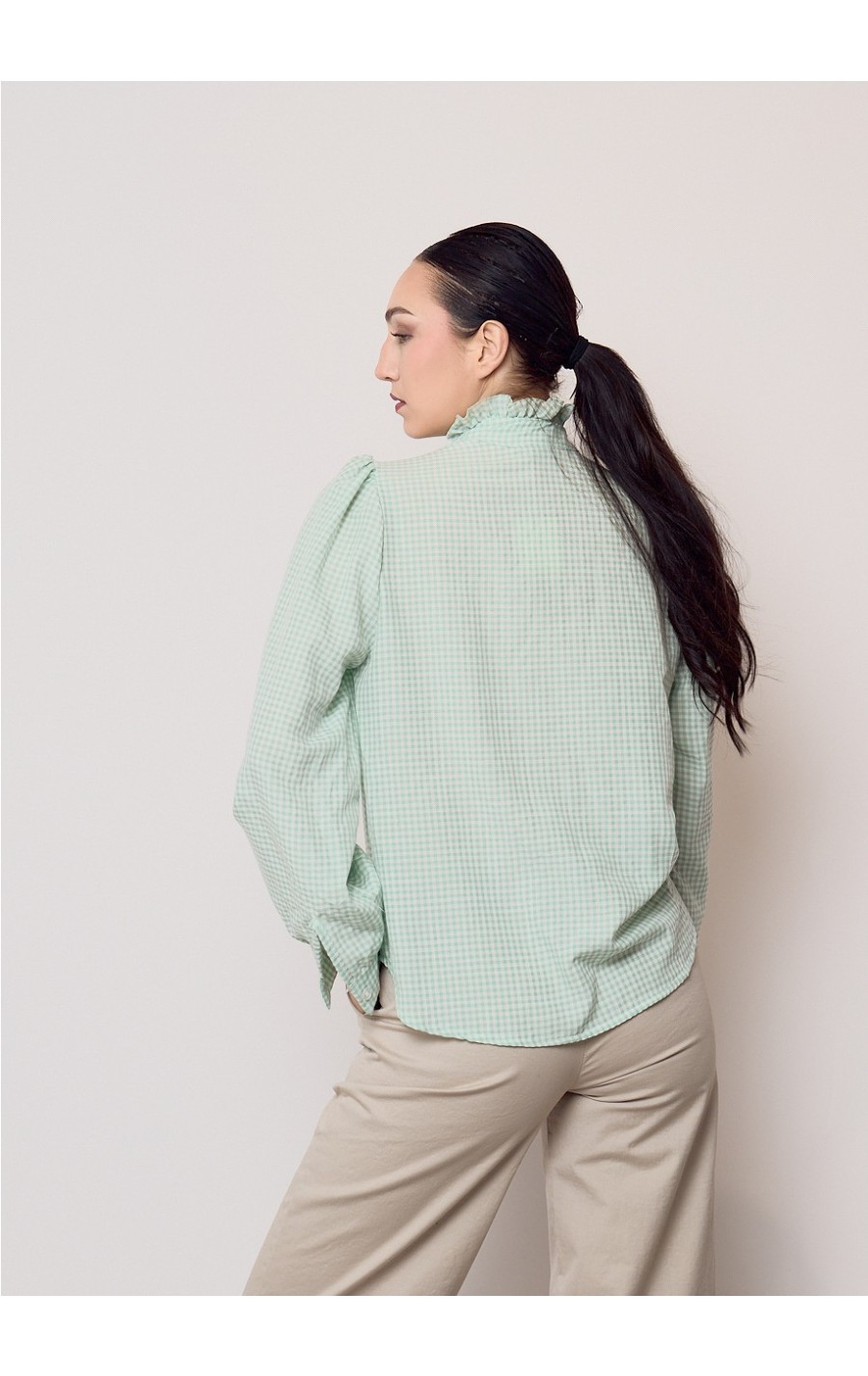 Blusa cuadro vichy con chorrera en cuello y pecho.