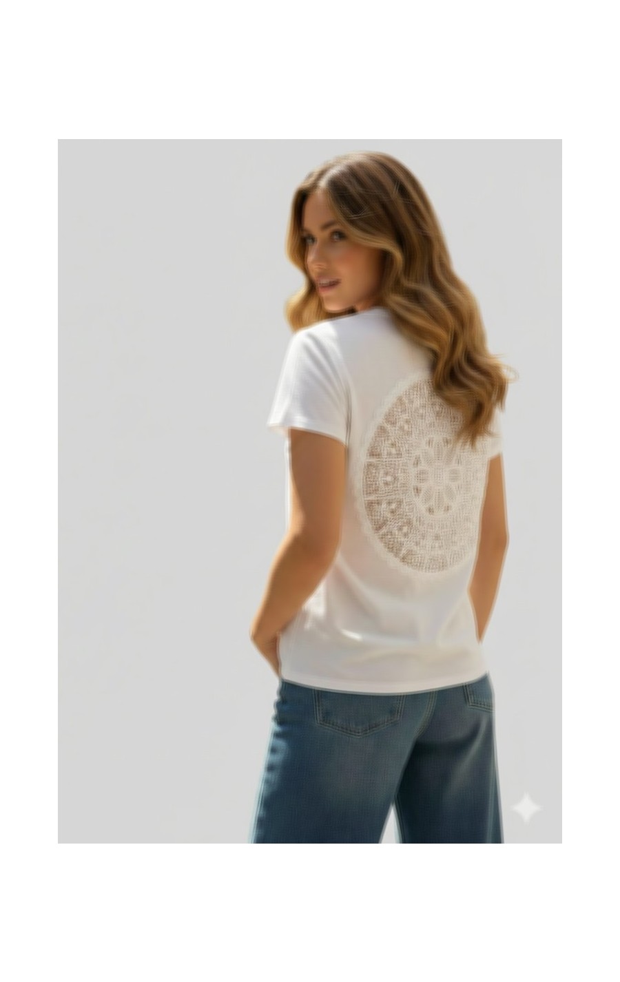 Camiseta con esfera troquelada en la espalda. Composición 95% algodón, 5% elastano.