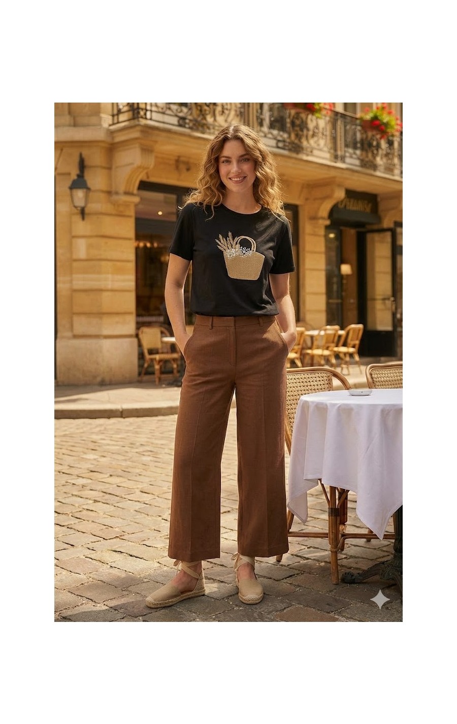 Camiseta con cesto de paja, el cesto tiene textura imitando al real. Composición: 95% algodón, 5% elastano